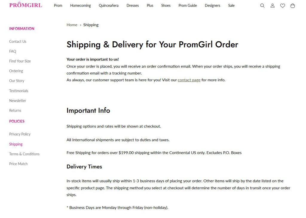 For an international online retailer like PromGirl, shipping and return policies are key factors.